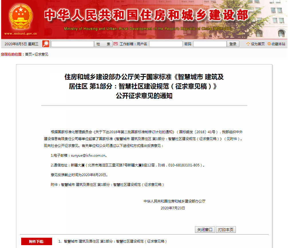 近日,住房和城鄉(xiāng)建設部發(fā)布了國家標準《智慧城市建筑及居住區(qū)第1部分:智慧社區(qū)建設規(guī)范》(征求意見稿)。