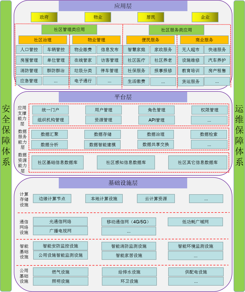 主要指構建智慧社區(qū)基礎運行環(huán)境、面向社區(qū)信息化建設的系列軟硬件設施,包括社區(qū)市政公用設施、網(wǎng)絡通信設施、智能基礎設施及計算存儲設施等。